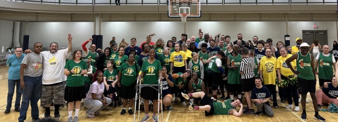 <above> The individuals we serve have the potential to achieve maximum independence in all aspects of their lives. Paladin's disability services follow a person-centered philosophy. Pictured above is right after a LaPorte Co. versus Lake Co. basketball game at Hammond Sportsplex.